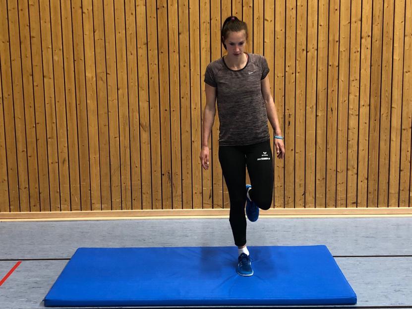 Übung: Mit paralleler Fußstellung hinstellen. Kräftig hochspringen, dabei einen Scherenschnitt mit angewinkeltem vorderem Bein machen. Wieder mit paralleler Fußstellung landen. Dabei leicht in die Hocke gehen. Beim nächsten Sprung das Bein wechseln, was vorne ist.